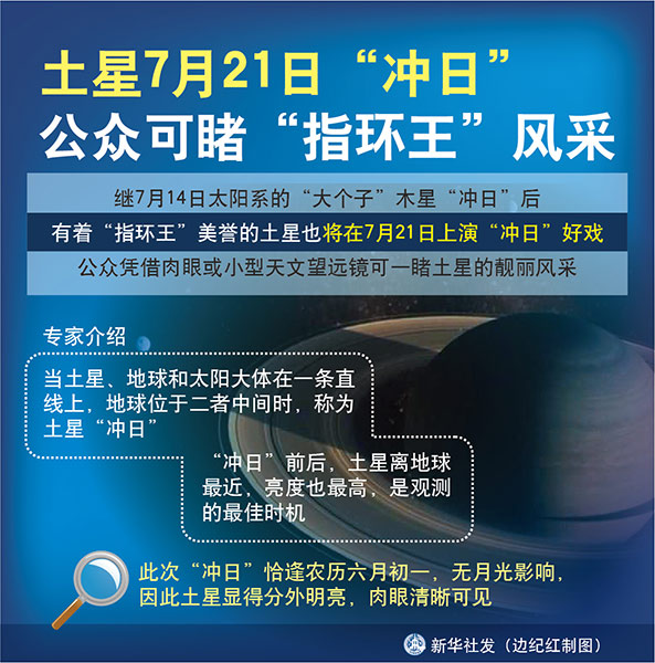 新華社天津7月19日電(記者周潤?。├^7月14日太陽系的“大個子”木星“沖日”后,有著“指環(huán)王”美譽的土星也將在7月21日上演“沖日”好戲,公眾憑借肉眼或小型天文望遠鏡可一睹土星的靚麗風(fēng)采。