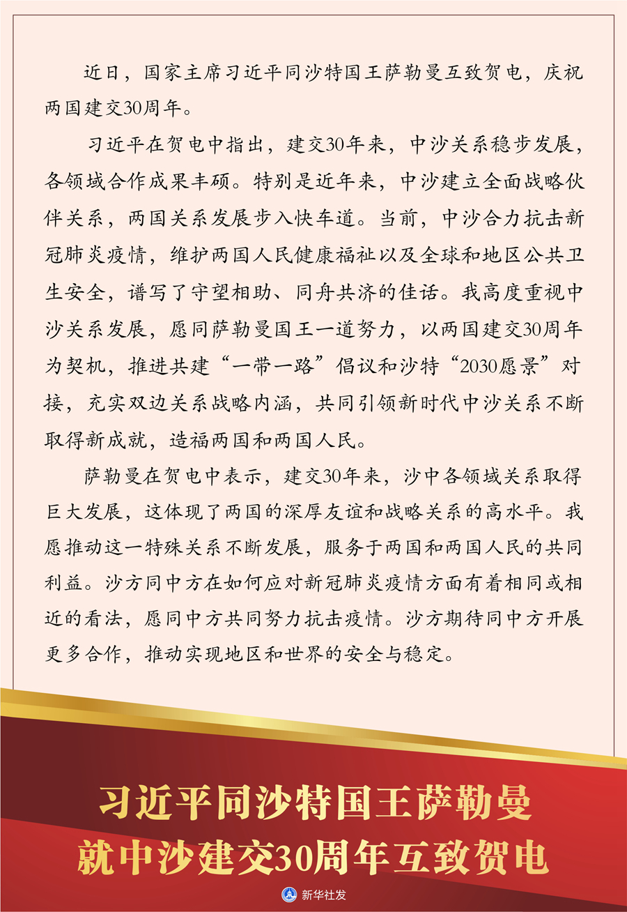 習(xí)近平在賀電中指出,建交30年來,中沙關(guān)系穩(wěn)步發(fā)展,各領(lǐng)域合作成果豐碩。特別是近年來,中沙建立全面戰(zhàn)略伙伴關(guān)系,兩國關(guān)系發(fā)展步入快車道。當(dāng)前,中沙合力抗擊新冠肺炎疫情,維護(hù)兩國人民健康福祉以及全球和地區(qū)公共衛(wèi)生安全,譜寫了守望相助、同舟共濟(jì)的佳話。我高度重視中沙關(guān)系發(fā)展,愿同薩勒曼國王一道努力,以兩國建交30周年為契機(jī),推進(jìn)共建“一帶一路”倡議和沙特“2030愿景”對接,充實(shí)雙邊關(guān)系戰(zhàn)略內(nèi)涵,共同引領(lǐng)新時代中沙關(guān)系不斷取得新成就,造福兩國和兩國人民。