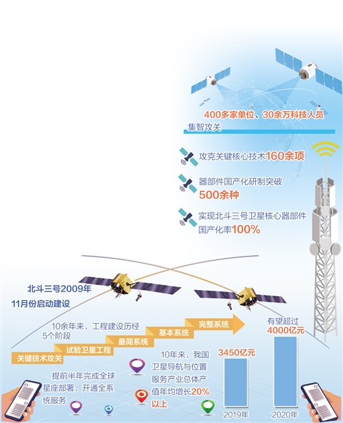 “北斗三號2009年11月份啟動建設(shè)。10余年來,工程建設(shè)歷經(jīng)關(guān)鍵技術(shù)攻關(guān)、試驗衛(wèi)星工程、最簡系統(tǒng)、基本系統(tǒng)、完整系統(tǒng)5個階段,提前半年完成全球星座部署,開通全系統(tǒng)服務(wù)。建成即開通、開通即服務(wù),工程建設(shè)取得了巨大成就?!比匠衅湔f。
