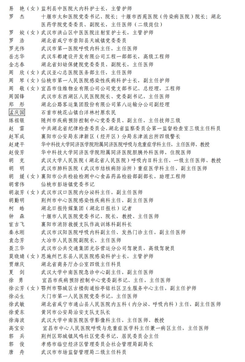 據(jù)湖北省人民政府網(wǎng)站消息,5日,湖北省人民政府發(fā)布關(guān)于全國(guó)抗擊新冠肺炎疫情先進(jìn)個(gè)人、先進(jìn)集體和全國(guó)優(yōu)秀共產(chǎn)黨員、全國(guó)先進(jìn)基層黨組織推薦對(duì)象的公示。武漢市武昌醫(yī)院原黨委副書(shū)記、院長(zhǎng),主任醫(yī)師劉智明等入選。