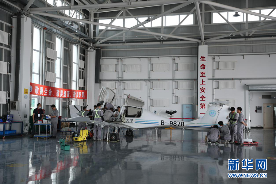 圖為中國民航大學(xué)內(nèi)蒙古飛行學(xué)院機庫中待飛的單發(fā)DA40D飛機。新華網(wǎng)記者焦鵬 攝