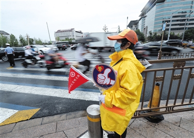 8月13日,西單路口,文明引導(dǎo)員在雨中維護(hù)路口秩序。新京報記者 王貴彬 攝