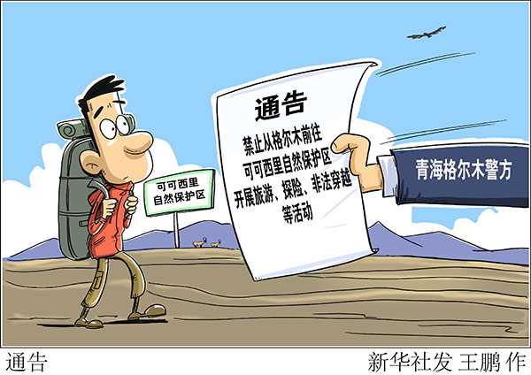 為加強可可西里自然保護區(qū)的管理和保護,保障廣大人民群眾和游客人身安全,維護社會治安秩序,格爾木市公安局根據(jù)有關法律法規(guī)和文件精神發(fā)布通告,禁止一切社會團體或個人隨意從格爾木前往玉樹藏族自治州可可西里自然保護區(qū),開展旅游、探險、非法穿越等活動。