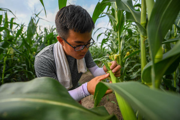 在吉林省梨樹(shù)縣四棵樹(shù)鄉(xiāng)三棵樹(shù)村的“科技小院”試驗(yàn)田,中國(guó)農(nóng)業(yè)大學(xué)在讀碩士沙野查看玉米長(zhǎng)勢(shì)(2019年7月24日攝)。新華社記者 張楠 攝?