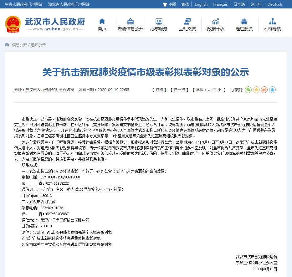 據(jù)武漢市人民政府網(wǎng)站消息,9月19日,武漢市抗擊新冠肺炎疫情表彰工作領(lǐng)導(dǎo)小組辦公室發(fā)布關(guān)于抗擊新冠肺炎疫情市級表彰擬表彰對象的公示,確定張鵬等870人為武漢市抗擊新冠肺炎疫情先進(jìn)個人擬表彰對象(含追授2人)。