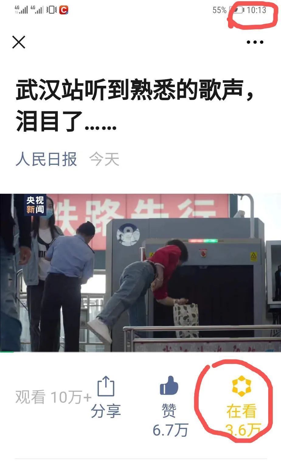 首先是央視的重磅炸彈,簡(jiǎn)直一個(gè)接一個(gè):早起就被一條《當(dāng)武漢火車站響起熟悉的歌聲……》的快閃新聞?wù)鸬盟查g淚奔。單是那前奏一起,看到如今擠擠挨挨的武漢火車站現(xiàn)場(chǎng)、交織著那曾經(jīng)至暗時(shí)刻的回憶,心疼、感動(dòng)、自豪……種種情愫油然而生!當(dāng)張定宇出現(xiàn)在鏡頭里,畫面定格在“這是英雄的祖國(guó)”,那一刻,心真的是知道了什么叫“DUANG”一下!快閃之后,現(xiàn)場(chǎng)群眾最多說(shuō)到的“不容易”和“安全感”,真是大家的心聲。也正是因?yàn)槿绱?,人民日?qǐng)?bào)微信公號(hào)16:36轉(zhuǎn)發(fā)這條視頻后,晚上10點(diǎn)剛過(guò),在看量就已經(jīng)達(dá)到3.6萬(wàn)——人心所向,可見(jiàn)一斑。