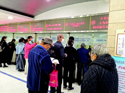 此時,這家醫(yī)院唯一一個現(xiàn)場掛號的窗口——面向70周歲以上老年人的窗口,已經(jīng)排起了長隊。老人們一個比一個來得早,仍有點兒神色緊張。