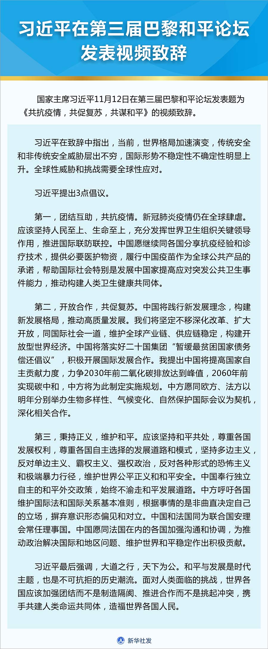 新華社北京11月12日電 國家主席習(xí)近平12日在第三屆巴黎和平論壇發(fā)表題為《共抗疫情,共促復(fù)蘇,共謀和平》的視頻致辭。