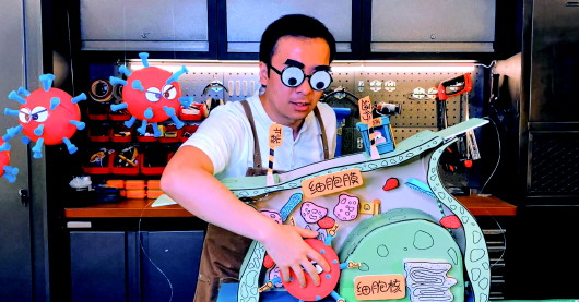 “新型冠狀病毒在細胞外面游走過程中,總能找到對應(yīng)的鎖眼,咔嚓,打開細胞上的鎖,天真的細胞誤以為營養(yǎng)物質(zhì)來了,于是大門敞開……”在一個約4分鐘的視頻中,寧原在工作間的長桌上用自己制作的病毒、細胞等模型,為粉絲趣味介紹新型冠狀病毒是如何入侵人體的。他還邀請武漢大學醫(yī)學部病毒學研究所專家來釋疑病毒變異的相關(guān)問題,那期視頻獲得了500多萬次觀看量。