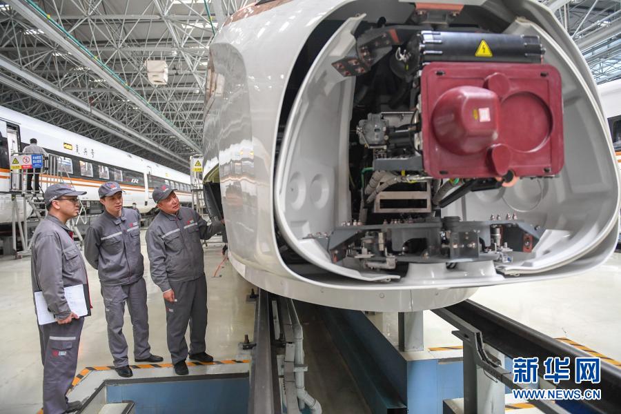 11月25日,在中車長春軌道客車股份有限公司高速動車組制造中心調(diào)試車間,羅昭強(右一)與同事檢查復(fù)興號高鐵列車的電氣系統(tǒng)。新華社記者 張楠 攝