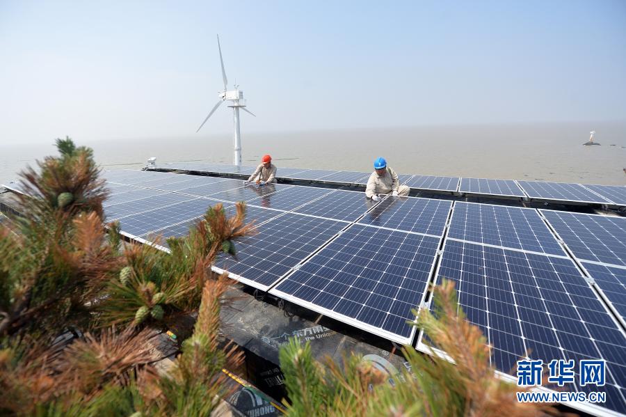 在江蘇省灌云縣開山島,國(guó)家電網(wǎng)的施工人員在屋頂上檢查光伏面板運(yùn)行情況(2019年6月18日攝)。新華社發(fā)(萬程鵬 攝)