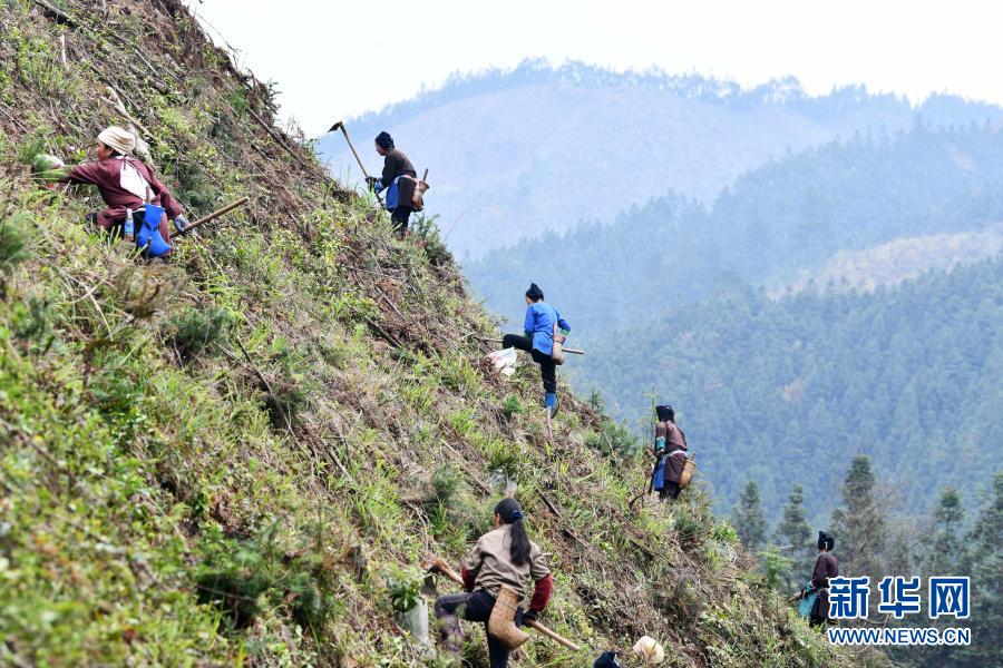 村民在貴州省錦屏縣春蕾林場(chǎng)的山坡上植樹(shù)(3月12日攝)。新華社記者 楊文斌 攝