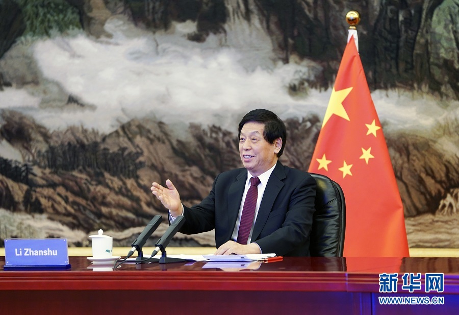 12月21日,全國(guó)人大常委會(huì)委員長(zhǎng)栗戰(zhàn)書(shū)在北京人民大會(huì)堂以視頻方式同韓國(guó)國(guó)會(huì)議長(zhǎng)樸炳錫舉行會(huì)談。新華社記者 張領(lǐng) 攝