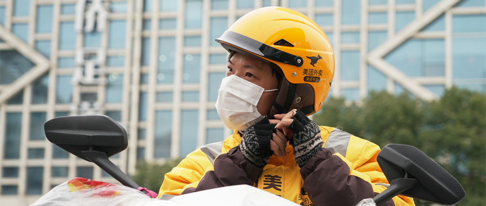 外賣小哥陳凱,戴著口罩,為陌生的人們運(yùn)送著米面油鹽和一日三餐。