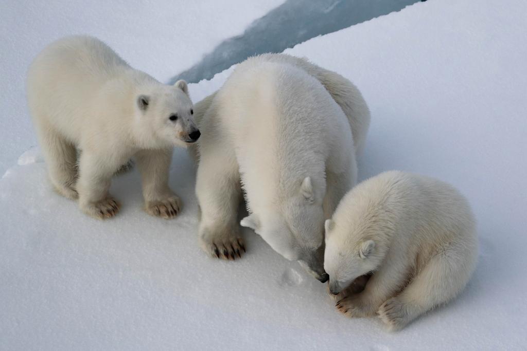 北冰洋高纬度地区的北极熊一家三口。新华社记者刘诗平 摄