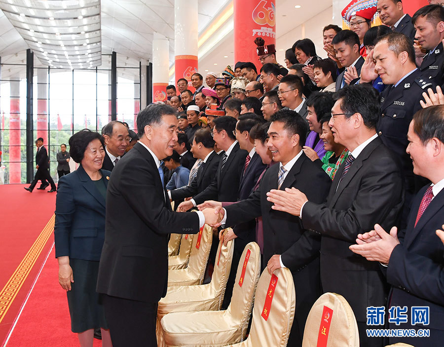 南寧荔園山莊會(huì)見廳內(nèi),圍欄上懸掛著鮮艷的紅綢帶,印有廣西壯族自治區(qū)成立60周年慶?;顒?dòng)徽標(biāo)的立柱高高聳立,簡(jiǎn)樸莊重的大廳洋溢著喜慶祥和的氣氛。汪洋等走上前去與大家親切握手,并代表中央代表團(tuán)向他們表示問候。