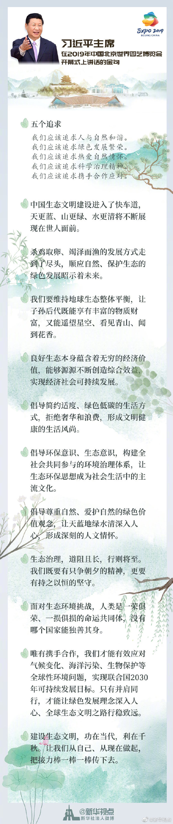習近平在2019年中國北京世界園藝博覽會開幕式上講話的金句