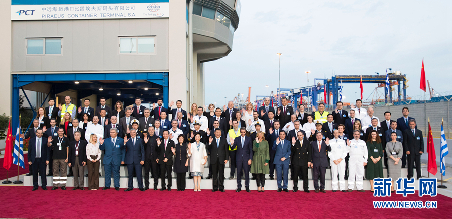 當?shù)貢r間11月11日,國家主席習近平和夫人彭麗媛在希臘總理米佐塔基斯夫婦陪同下,共同參觀中遠海運比雷埃夫斯港項目。這是習近平夫婦和米佐塔基斯夫婦同中遠當?shù)貑T工等合影。 新華社記者 黃敬文 攝