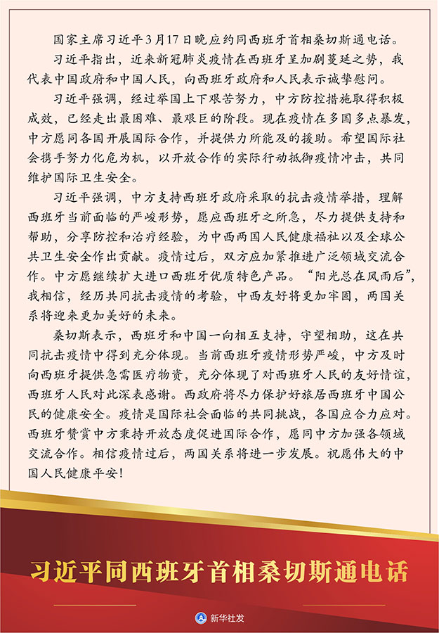 習(xí)近平指出,近來(lái)新冠肺炎疫情在西班牙呈加劇蔓延之勢(shì),我代表中國(guó)政府和中國(guó)人民,向西班牙政府和人民表示誠(chéng)摯慰問(wèn)。