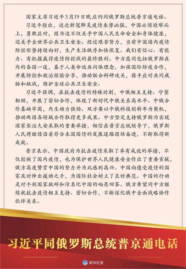 習近平指出,這次新冠肺炎疫情來勢兇猛,中國必須迎難而上,勇敢應對,因為這不僅關乎中國人民生命安全和身體健康,還關乎全世界公共衛(wèi)生安全。經(jīng)過艱苦努力,當前中國國內疫情防控形勢持續(xù)向好,生產(chǎn)生活秩序加快恢復。我們有信心、有能力、有把握贏得疫情防控戰(zhàn)的最終勝利。中方愿同包括俄羅斯在內的各國一道,基于人類命運共同體理念,加強國際防疫合作,開展防控和救治經(jīng)驗分享,推動聯(lián)合科研攻關,攜手應對共同威脅和挑戰(zhàn),維護全球公共衛(wèi)生安全。