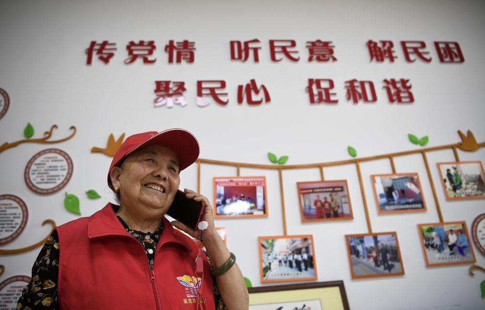 2005年,宁夏吴忠市回族妇女王兰花从社区居委会主任岗位退休后,与6名老同事成立了“王兰花热心小组”。她带领团队二十年如一日坚持志愿服务,每天奔走在社区各个角落,照顾空巢老人、留守儿童,化解矛盾纠纷,帮助解决社区居民的操心事、烦心事、揪心事,用无私奉献温暖着每一个人的心田,成为社区志愿服务“领头羊”,吸引越来越多的人加入志愿服务队伍。这是2021年6月16日,王兰花在社区工作站与居民通电话。
