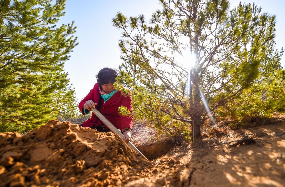2021年3月23日,殷玉珍在内蒙古毛乌素沙漠挖土,查看松树根部的生长情况。20世纪80年代,殷玉珍嫁到这片沙地时,眼前只有漫无边际的黄沙。1986年,她埋下第一棵树苗,从此与风沙较劲。如今,7万多亩荒沙披上了绿装,治理好的土地上种起了小米,金灿灿的谷穗成了“沙漠黄金”。