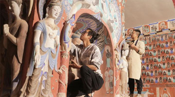 5月16日,国博文保院修复师王熙林(前左)向媒体记者介绍圆明园同乐园建筑群样式雷烫样文物修复情况。
