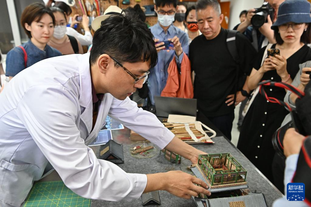 5月16日,国博文保院修复师向媒体记者介绍圆明园同乐园建筑群样式雷烫样文物材质、构造等内容。