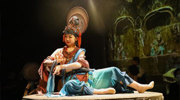 6月3日晚,在甘肃省酒泉市敦煌市乐动敦煌剧场,大型洞窟式沉浸体验剧《乐动敦煌》的演员在演出。