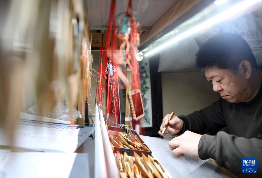 4月9日,申涛在位于营口市的家中进行缂丝作品创作,一排梭子挂在缂丝机上。