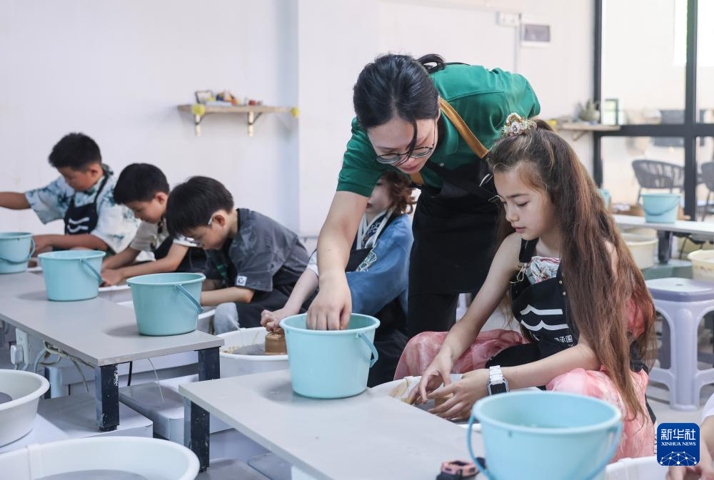7月3日,在慈溪市匡堰镇上林湖青瓷文化传承园的暑期青瓷文化课堂上,小学生在工作人员的带领下体验青瓷拉坯。