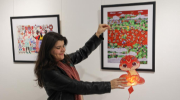 2月11日,毕六福展示印有卡通图案和熊猫图案的油纸伞。