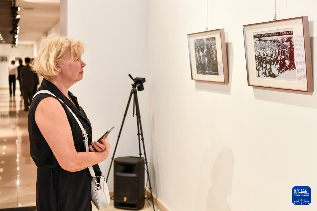 6月5日,在俄罗斯首都莫斯科,嘉宾参观纪念中国人民抗日战争暨世界反法西斯战争胜利80周年图片展。