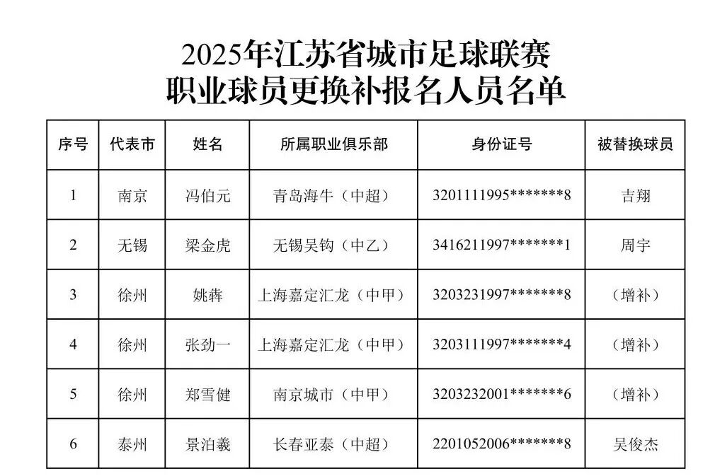 根据规定,“苏超”淘汰赛前可以对3名职业球员进行调整,图为各队调整结果。