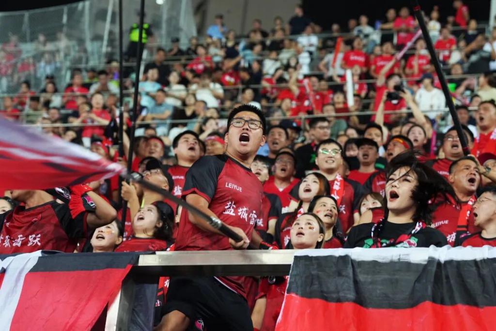 “苏超”第13轮,盐城队球迷在为球队加油。来自盐城发布