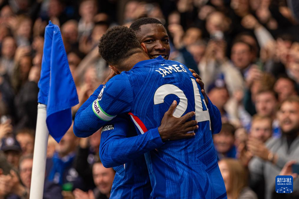 10月4日,切尔西队球员凯塞多(后)进球后与队友詹姆斯拥抱庆祝。新华社发