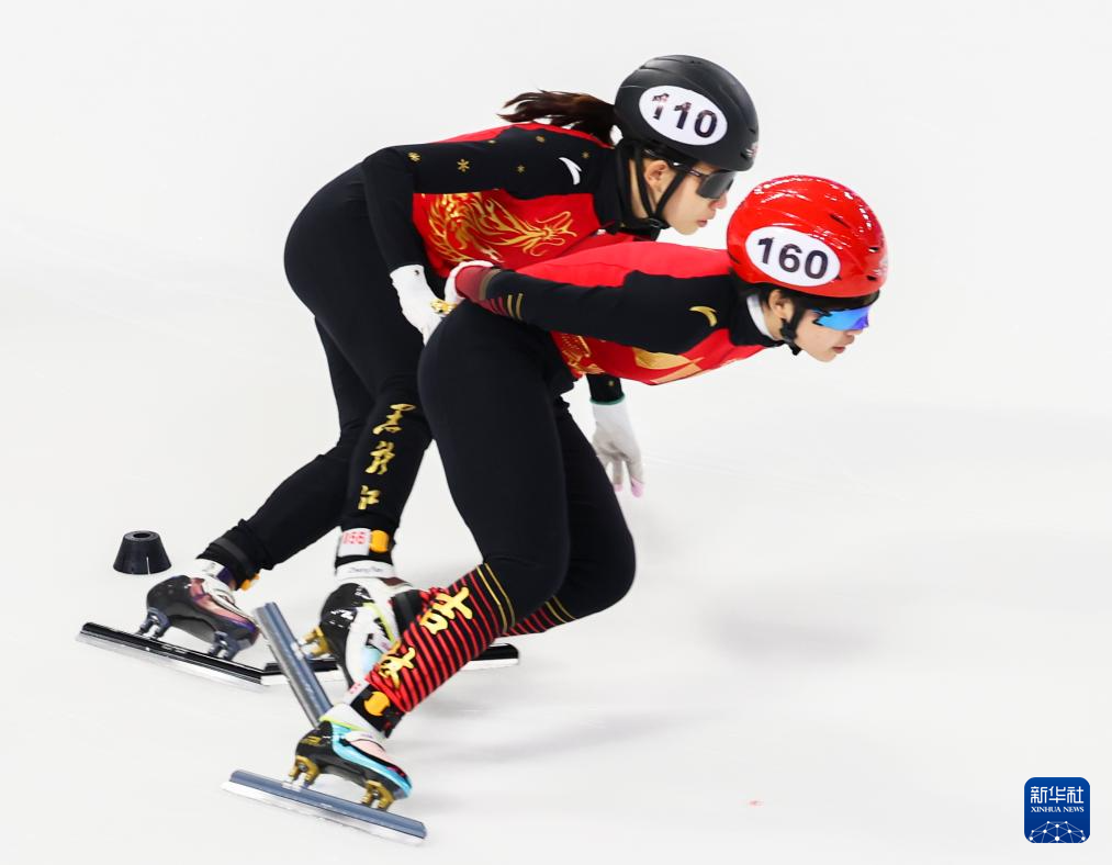 10月11日,黑龙江省冰上训练中心选手张延(右)在甲组女子1000米决赛中。最终,她获得冠军。