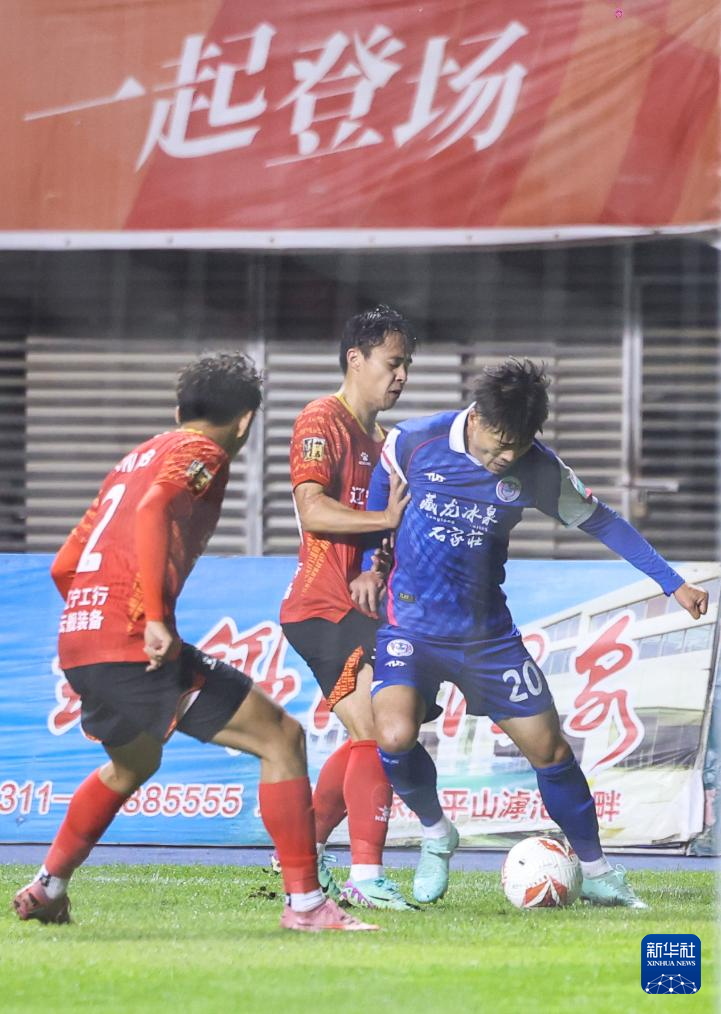 10月11日,石家庄功夫队球员安屹斐(左三)在比赛中进攻。