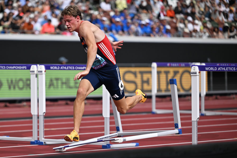 2025年9月21日,挪威选手斯科特海姆在110米栏比赛中。当日,2025年世界田径锦标赛男子十项全能比赛在日本东京举行。新华社记者 宋彦桦 摄