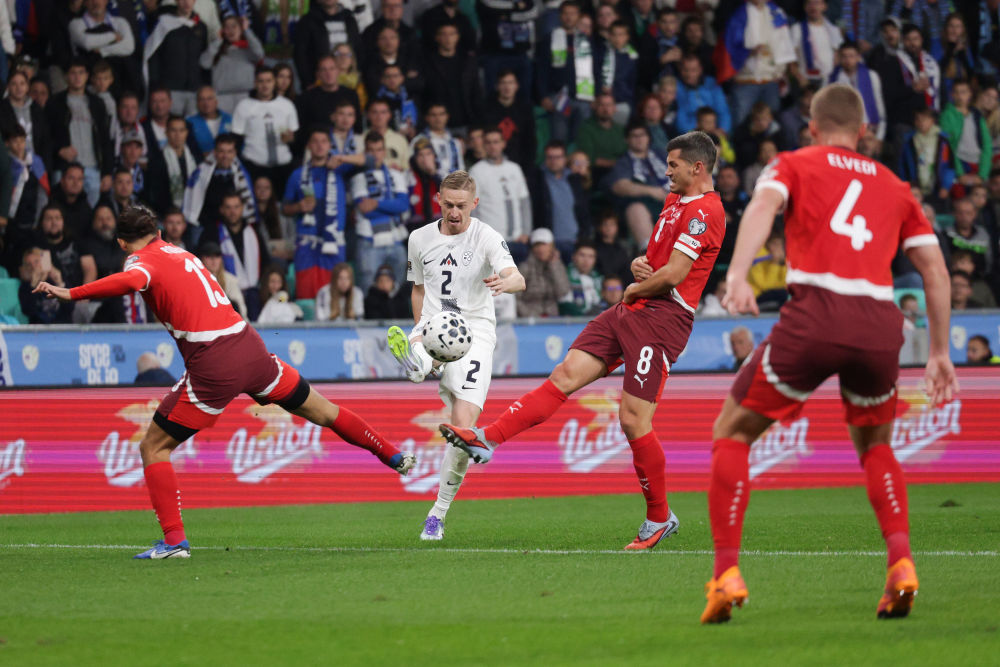 10月13日,斯洛文尼亚队和瑞士队球员在比赛中拼抢。(泽利科·斯特凡尼奇 摄)