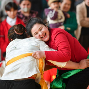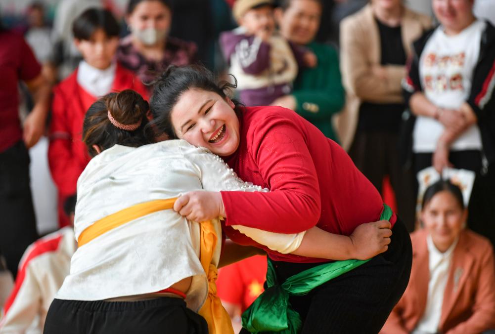 4月12日,村民在新疆于田县全民健身中心参加女子摔跤比赛。新华社记者 胡虎虎 摄