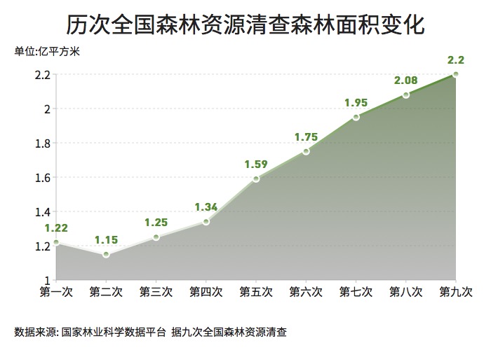 ??? 根據(jù)國家林業(yè)和草原局統(tǒng)計,目前全國森林面積達到2.2億公頃,森林覆蓋率23.04%?;赝糯稳珖仲Y源清查結(jié)果可以看出,我國的森林覆蓋率逐年穩(wěn)步提高。還有一些監(jiān)測數(shù)據(jù)顯示,近20年來中國新增植被覆蓋面積約占全球新增總量的25%,居全球首位。