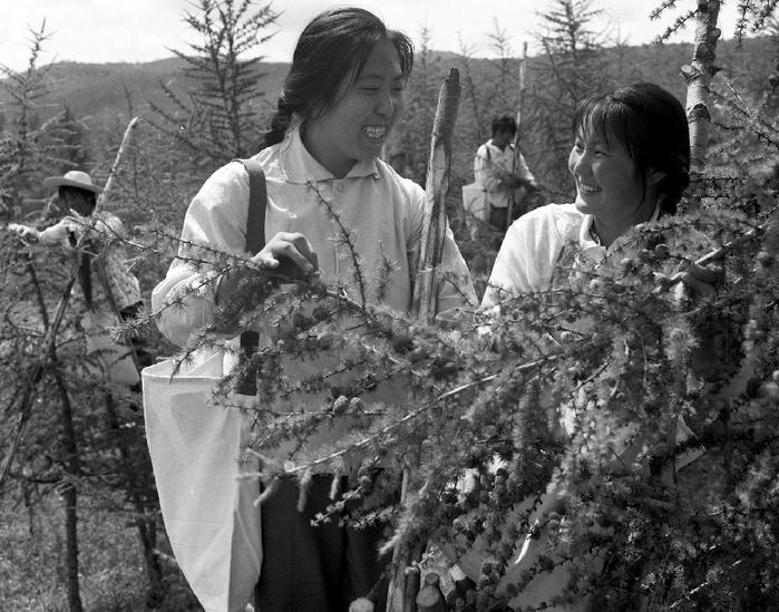 ??? 河北省圍場縣塞罕壩機械林場職工積極采摘松樹種,解決人工造林需要。新華社記者趙連升攝 1978年10月30日發(fā)