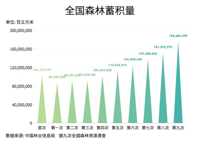??? 森林蓄積量是反映一個國家或地區(qū)森林資源總規(guī)模和水平的基本指標(biāo)之一,也是反映森林資源的豐富程度、衡量森林生態(tài)環(huán)境優(yōu)劣的重要依據(jù)?!笆濉逼陂g,我國森林蓄積量超過175.6億立方米,森林植被碳儲量91.86億噸。