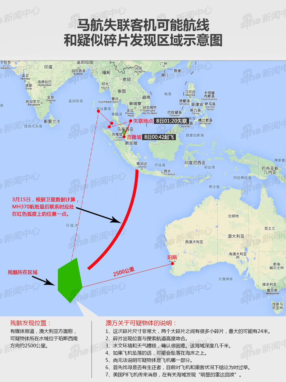 ??? 發(fā)現(xiàn)可疑碎片的位置與馬航失聯(lián)客機南部搜尋航道高度吻合