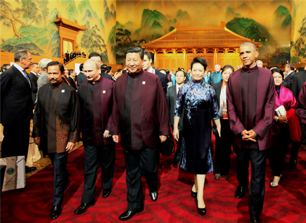 ????18時許,與會貴賓穿著為本次會議專門設(shè)計的特色中式服裝陸續(xù)抵達(dá)。習(xí)主席說,貴賓們都穿著中國式服裝,讓大家更感親近,就像到鄰居家串門,來朋友家敘舊一樣。