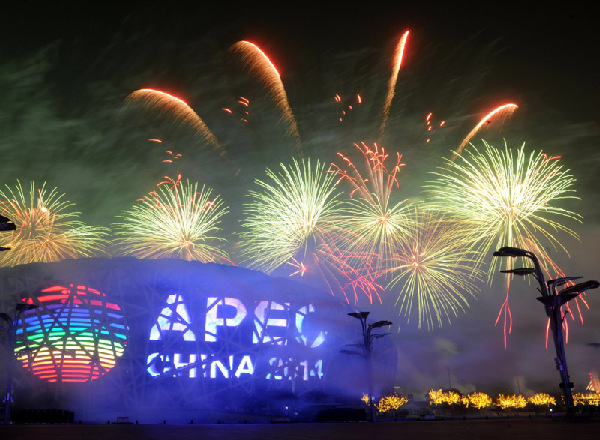 17時40分許,水立方和鳥巢的彩燈已經(jīng)在夜色中閃亮。當(dāng)晚,國家主席習(xí)近平和夫人彭麗媛在北京國家游泳中心(水立方)舉行宴會,歡迎出席APEC會議的各成員經(jīng)濟(jì)體領(lǐng)導(dǎo)人或代表及配偶。