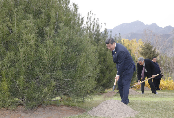 11時40分許,習(xí)主席與各成員經(jīng)濟(jì)體領(lǐng)導(dǎo)人或代表前往植樹。習(xí)主席在開幕辭中希望,亞太經(jīng)濟(jì)體以北京雁棲湖為新的起點(diǎn),引領(lǐng)世界經(jīng)濟(jì)的雁陣,飛向更加蔚藍(lán)而遼闊的天空。