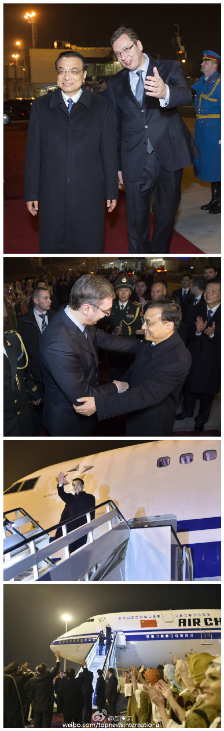 ??? 李克強(qiáng)總理當(dāng)?shù)貢r(shí)間18日傍晚乘專機(jī)離開塞爾維亞首都貝爾格萊德。在塞期間,李克強(qiáng)出席了中國(guó)—中東歐國(guó)家領(lǐng)導(dǎo)人第三次會(huì)議并成功對(duì)塞爾維亞進(jìn)行了首訪。塞爾維亞總理武契奇率兩位副總理和多位部長(zhǎng)到機(jī)場(chǎng)送行。