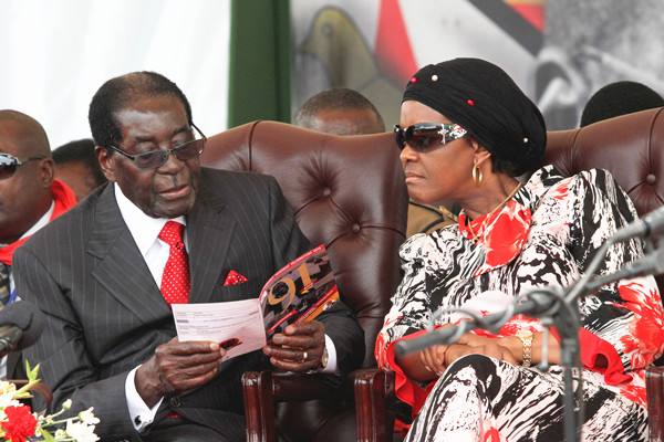 2015年2月28日,津巴布韋總統(tǒng)穆加貝與夫人格蕾絲在民眾為穆加貝舉行的91歲生日大型慶典上翻閱小冊(cè)子。新華社發(fā)(費(fèi)列蒙攝)